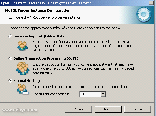 12.这里是选择mysql允许的最大连接数,第一种是最大20个连接并发数,第二种是最大500个并发连接数,最后一种是自定义,你可以根据自己的需要选择。这里我选择第三种