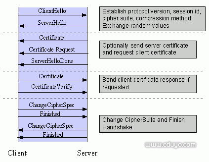 SSL会话在客户端和服务器的握手过程之后建立,如Figure 1所示,其过程可能因服务器是否配置为支持服务器证书和是否要求有客户证书有所不同。虽然存在密码信息管理需要额外握手操作的情况,本文只说明其中有共性的部分,参见所有可能情况下的SSL规范。