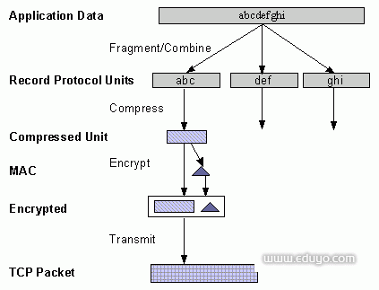SSL记录协议,如Figure 3所示,用于客户端和服务器之间的传输应用和SSL控制数据,可能把数据分割成较小的单元,或者组合多个较高层协议数据为一个单元。在使用底层可靠传输协议传输数据单元之前,它可能会对这些单元进行压缩、附着摘要签名和加密(注意:目前所有主要SSL的实现都缺乏对压缩的支持)。