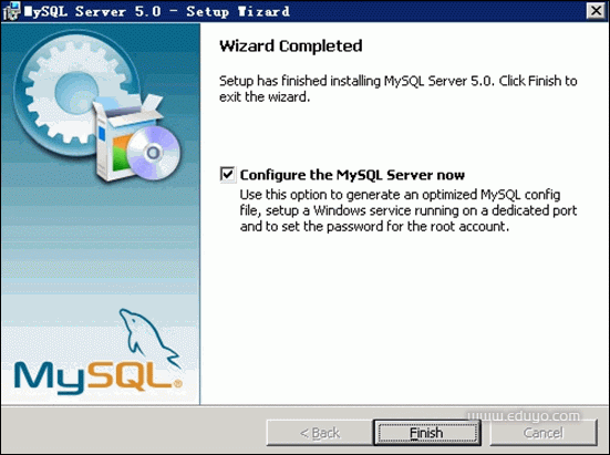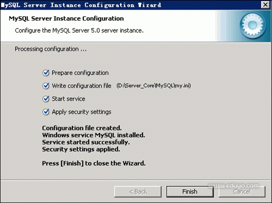 待文件复制安装完毕后,进行 MySQL 设置界面,单击 Finish 。如图 4 所示: