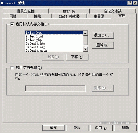 (3) 单击"文档"页签,在默认内容文档中添加 index.htm、index.html、index.php 三个文件,并将所有默认文档排序,顺序按照下图所示。完成后,单击"确定",关闭站点属性配置窗口,回到 IIS 管理器主界面。如图 23 所示:
