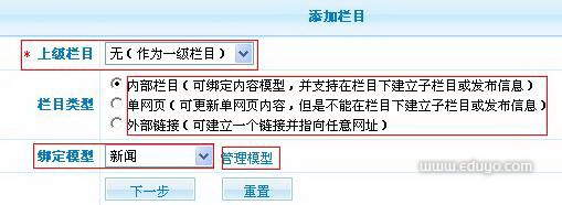 添加栏目,根据自己的需求是否有上级栏目,并且选择合适的栏目类型,