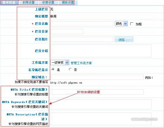 同时要绑定一个模型,如果建立一个新闻栏目,那么就要绑定“文章”模型。
