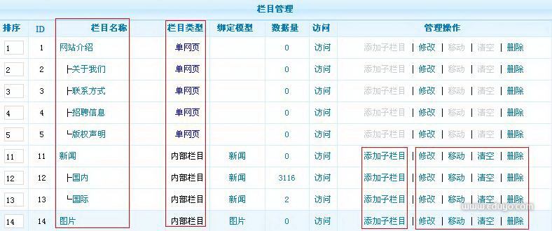管理栏目,修改、添加子栏目、删除、移动、清空操作