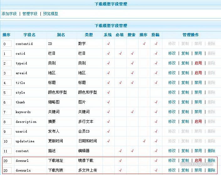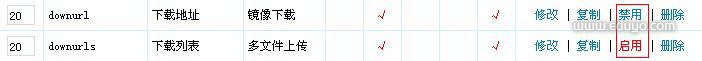 3、找到 downurl 字段并 启用,找到 downurls 字段并 禁用