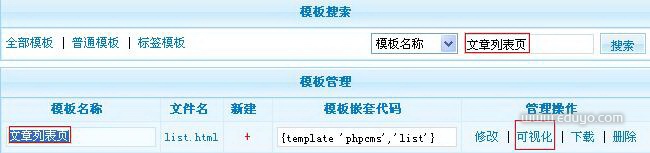 1、我们找到文章列表页模板(位置:模板风格----Phpcms----管理模板),搜索(文章列表页)