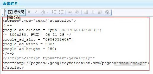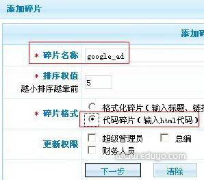 填写好碎片名称,点击“下一步”,在编辑器中填写你的google广告代码。