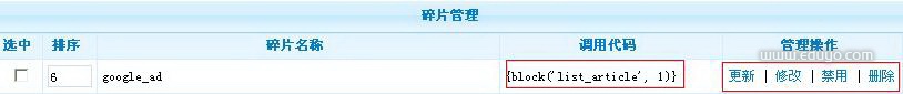 2、通过碎片的“调用代码”我们可以做到自由调用,格式:{block('list_article', 1)},把调用代码粘贴到想要调用的前台模板中