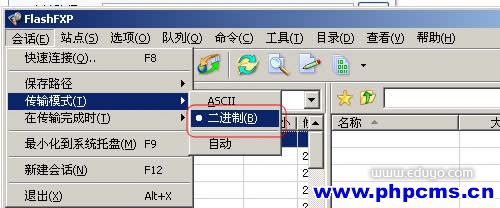 在连接到网站之前我们还有一件十分重要的事情要做,那就是需要到“会话”中选择我们的“传输模式”为“二进制” 这一点非常的重要否则上传的文件将不能正常的为我们工作。