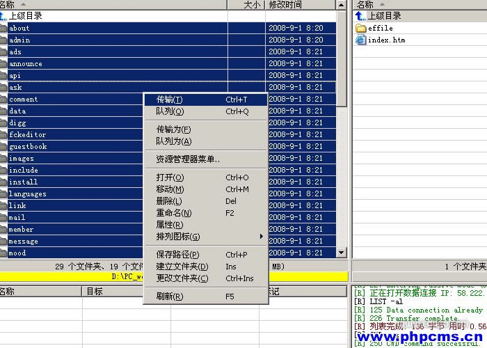 最后我们在“站点管理器”中找到刚才建立的站点,点击右下的“连接”进入文件传输状态。 选中左框中的全部文件,按下鼠标右键“传输”即可,再下来就是等待全部文件传送到服务器。