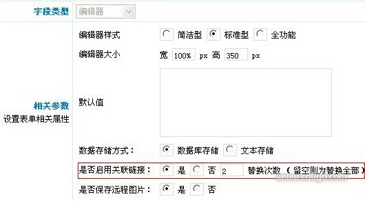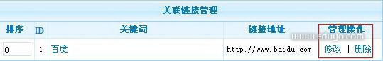关联链接是指在文章内容中找到“关联链接名称”加上“关联链接网址”,如,我们添加一个“百度”关联到“http:www.baidu.com”,在发布文章的时候如果出现”百度“这个关联子 就是替换成 < a class="keylink" target="_blank" href="http://www.baidu.com" >百度</a> 关联连接设置:位置:系统设置----模型管理----管理模型----字段管理--内容(字段名称)