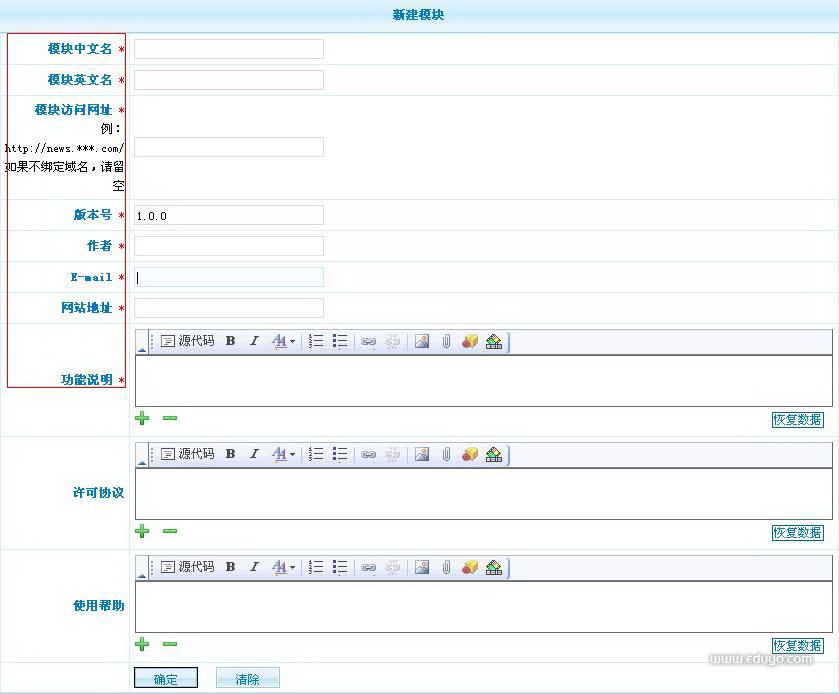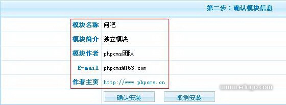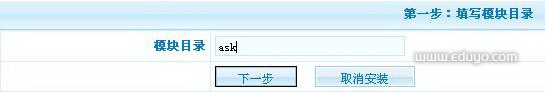 注意:安装模块前,请确认将该模块文件夹上传至服务器上,模块位于网站根目录。 模块目录填写的是该模块相对于根目录的路径,如友情链接模块:link,问吧模块:ask。