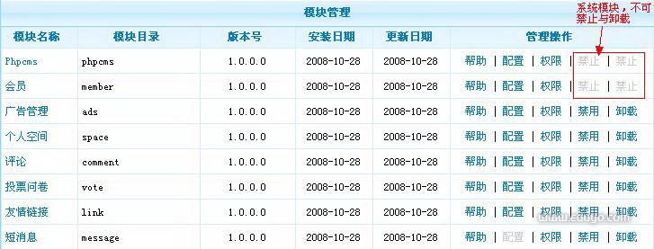注意:phpcms、会员是系统必须的,不能卸载与禁用。