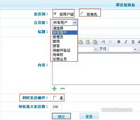 短消息发送,可以根据用户组、角色来发送,同时可以发送邮件