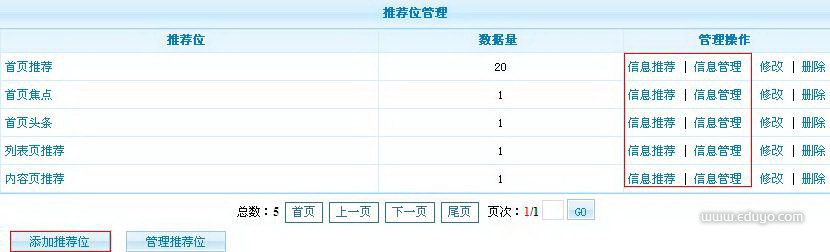 4、进入“管理推荐位”,您可以了系统的解推荐位列表,并且管理当前系统的推荐位,同时可以通过:(位置:系统设置----相关设置----推荐位管理----管理推荐位)来管理推荐位。