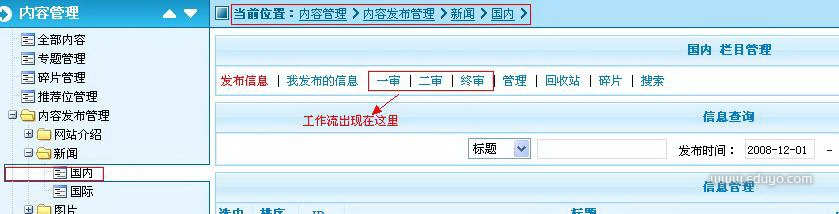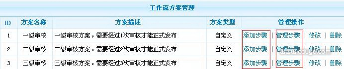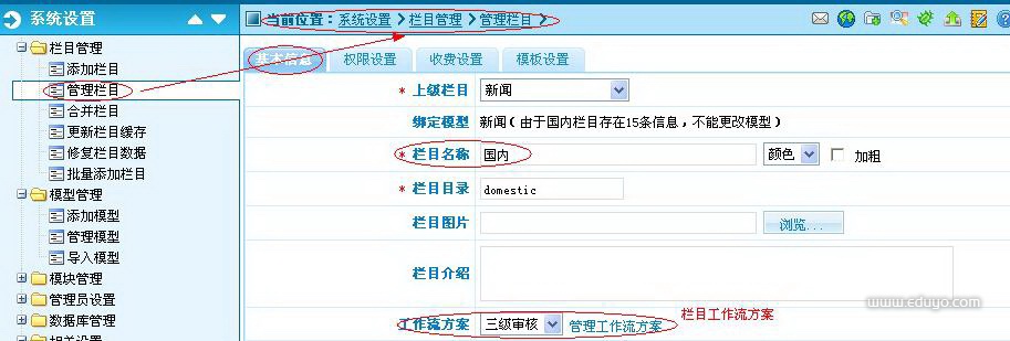 对于栏目我们可以设置“工作流方案”(系统设置--栏目管理--管理栏目),修改栏目属性,适合对栏目内容分级审核