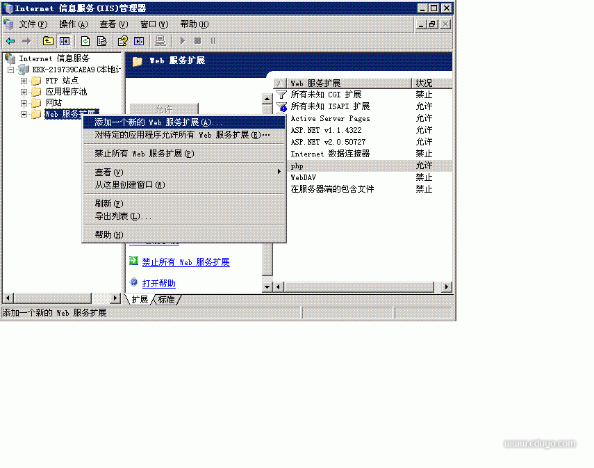 (4) 右键单击"Web 服务扩展",添加 PHP 扩展支持。如图 24 所示: