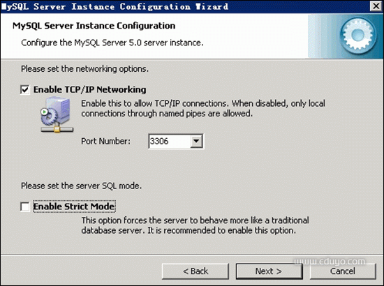 设定 MySQL 网络参数,注意:不要启用 Strict Mode! 如图 9 所示: