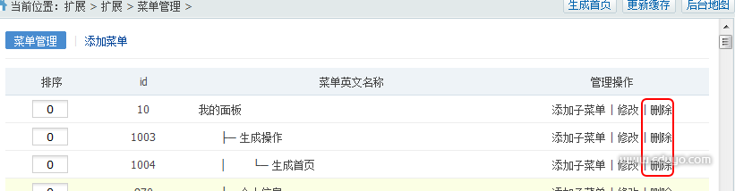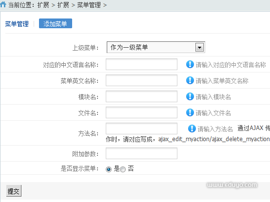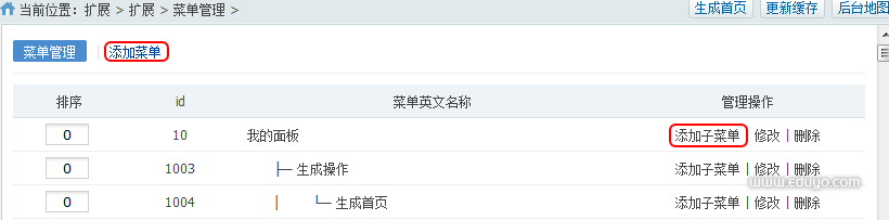 导航栏 选择扩展 -> 菜单栏 选择 菜单管理-> 顶部添加菜单或者 在菜单列表选择添加子菜单
