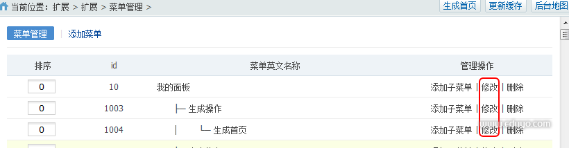 导航栏 选择扩展 -> 菜单栏 选择 菜单管理 -> 对应菜单右侧的编辑 如下图: