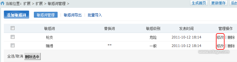 导航栏 选择扩展 -> 菜单栏 选择 敏感词管理 -> 对应敏感词右侧的修改 如下图: