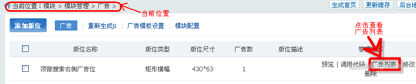 1.添加版位 版位类型:矩形横幅,固定位置,漂浮移动,对联广告,图片轮换广告,图片列表广告,文字广告,代码广告。这里不做详细展示介绍。 2.版位管理 3.添加广告 操作步骤:模块——>模块管理——>广告———>广告列表——>添加广告 4.广告管理 5.重新生成JS(注:当你修改了广告配置时,请重新生成。) 6.配置 可对广告进行配置管理,如下图: