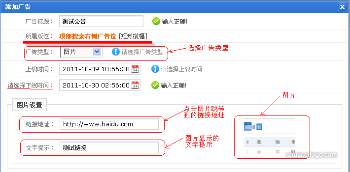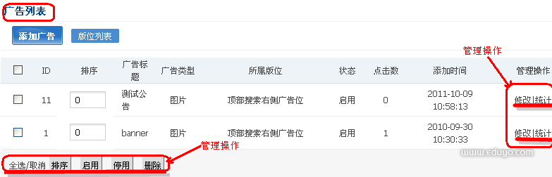 操作步骤:模块——>模块管理——>广告———>广告列表——>添加广告