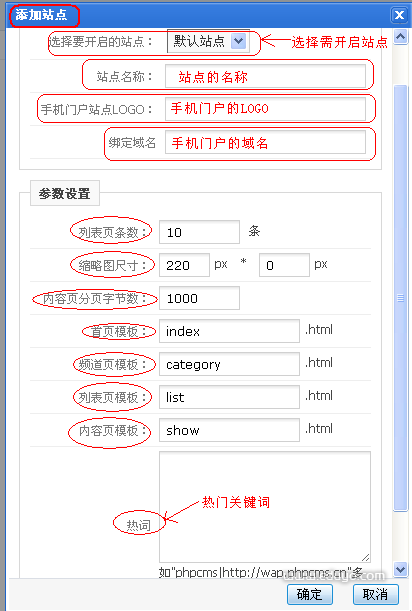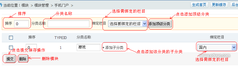 1.添加站点 注:一个站点只能添加一个手机门户。 2.管理站点 站点修改,删除和分类的管理。 3.分类管理 输入(或选择)修改(或添加)的内容。点击“提交”完成保存操作。