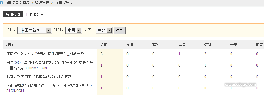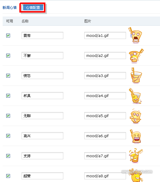 1.添加新的心情 a. 复制心情图片至 statics\images\mood 目录 b. 心情配置添加新复制的图片心情,提交。如下图 前台显示如下: 2.新闻心情 查看所有新闻心情。 3.心情配置 不同心情的修改与配置。
