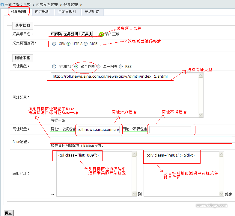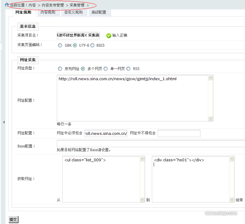 实例说明: 目标:采集新浪新闻到V9系统 “国内” 栏目中。 目标网址:http://roll.news.sina.com.cn/news/gjxw/gjmtjj/index.shtml 1、添加采集点 2. 网址规则配置1. 添加采集点,填写采集规则