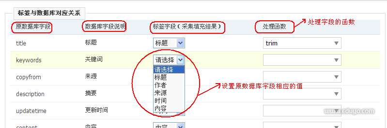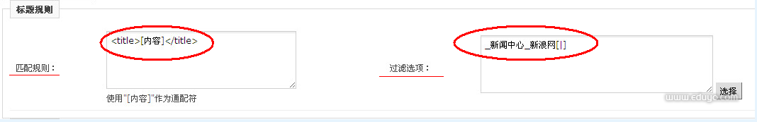 标题采集配置: 从网页<title></title>里取标题,并去除不需要的字符。如下图