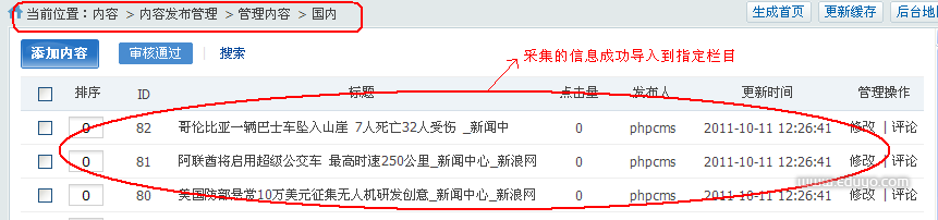 提交成功将采集内容导入到指定栏目(如下图所示)。在此期间请耐心等待, 完成后会自动转向。至此一个简单的采集流程就操作完成。在指定的栏目下已经存在你采集的内容信息。