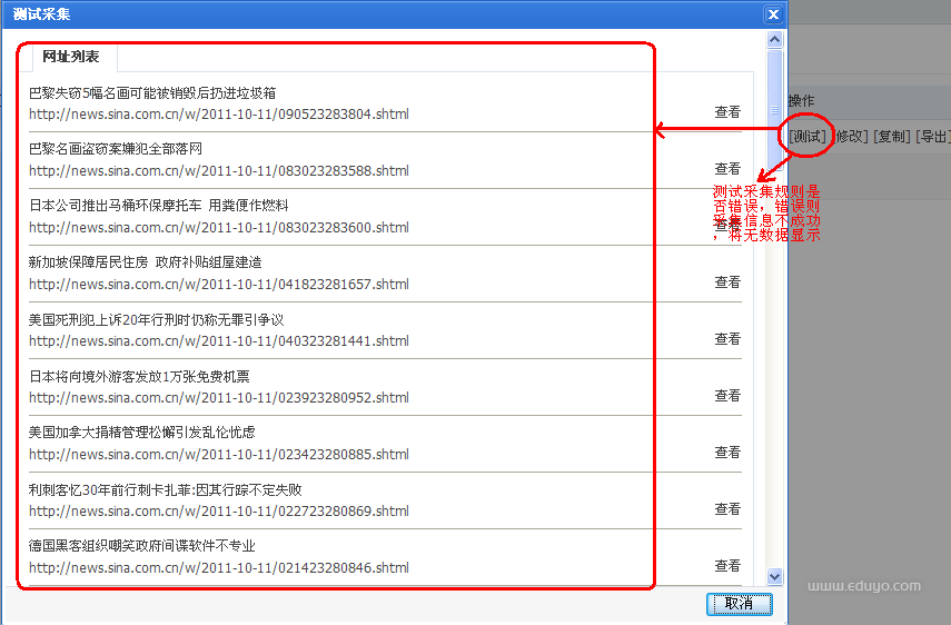 目标网页——>右键——>查看源代码——>找到你要采集的源代码开始和结束,按“上图”填写规则。添加成功后,测试你的网址采集规则是否正确,如下图所示: