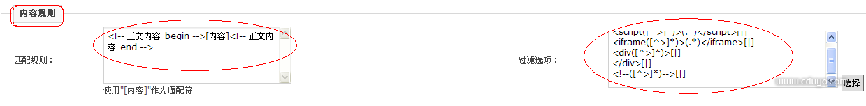 内容采集配置: 新浪新闻最终页,新闻内容都包含在 <!-- 正文内容 begin --> <!-- 正文内容 end --> 之间,而且这二个结点,在整个页面源代码中具有唯一性。所以可以以此为规则取内容。并对内容进行过滤。如下图