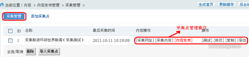 添加采集点测试成功后,你可以管理你添加的采集点(采集网址,采集内容,内容发布,测试,修改,复制,导出).如下图所示: