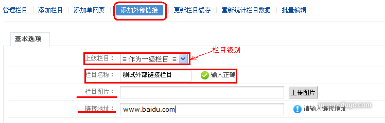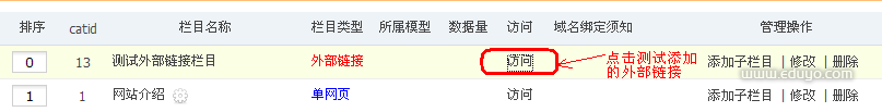 添加成功后,到“栏目管理”找到添加的外部链接,点击“访问”(如下图)就跳转到指定页面了。