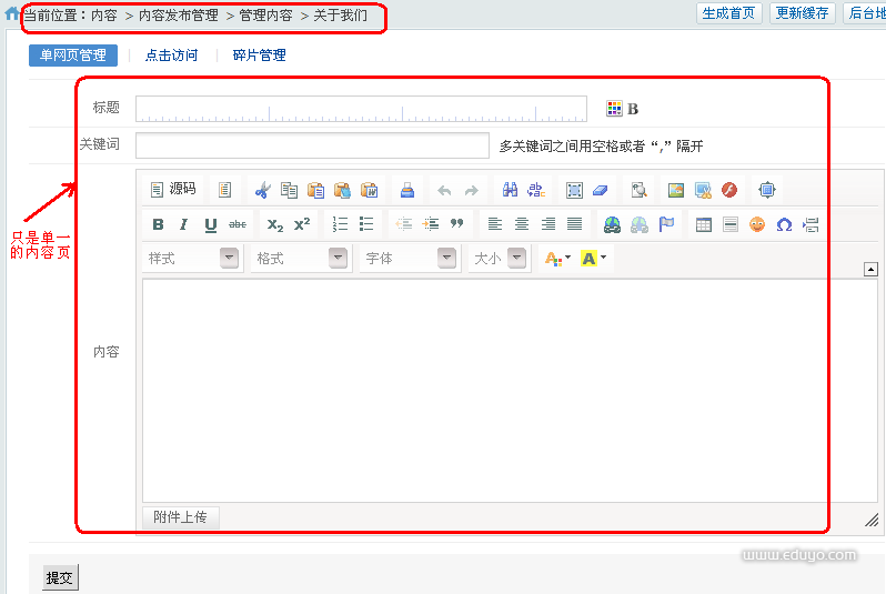 2,单网页相当于内容页,只能是单一的信息页。如下图: