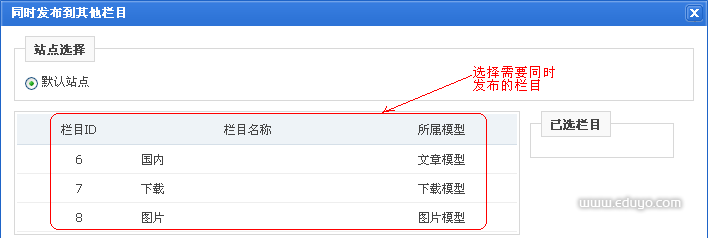 点击“同时发布到其他栏目”按钮时弹出如下页面: