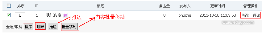 可以选择内容进行修改,评论管理,排序,推送,批量移动,删除等。