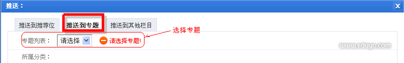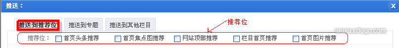 可以选择内容推送到推荐位,专题和其他栏目。如下图: