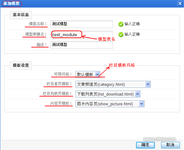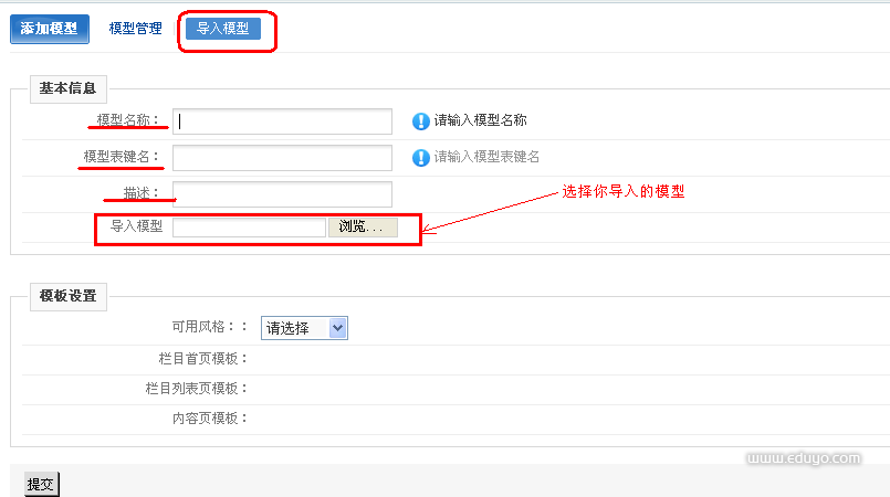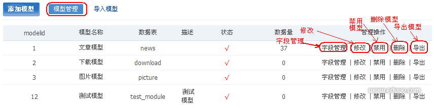 1.添加模型 2.管理模型 A.字段管理 可以对该模型下的字段进行管理(添加,删除,修改,禁用,预览)。如下图所示: 3.导入模型 用于已经在其他站点添加并且导出的模型。如下图所示: