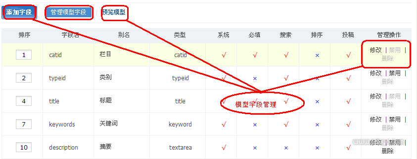 可以对该模型下的字段进行管理(添加,删除,修改,禁用,预览)。如下图所示: