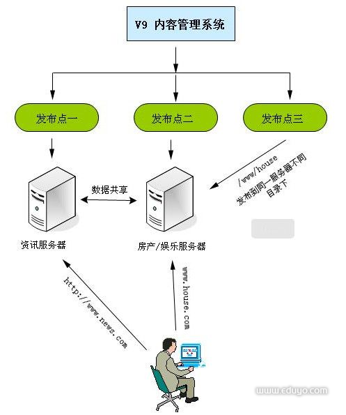 V9 系统内置的发布点功能结合站群功能,通过发布点可将各子站点内容发布到不同的服务器上,轻松实现服务器集群部署。以实现负载的分离,更加符合大访问量网站的需求。为用户提供更好的用户体验。示意图如下