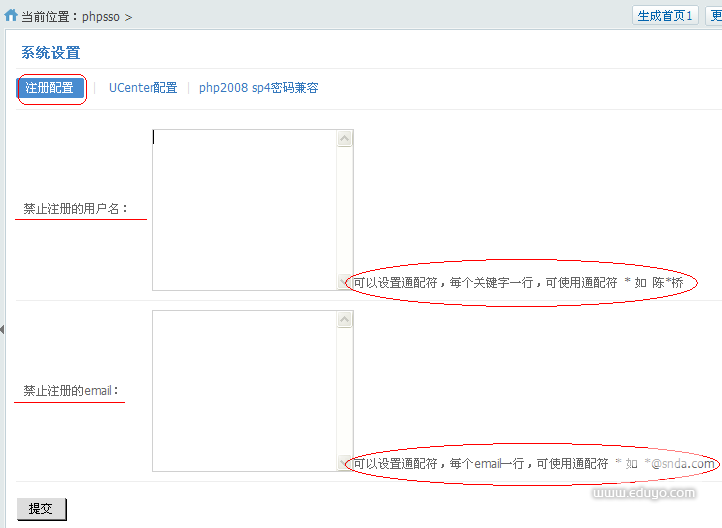 设置禁止注册用户名,E-MAIL等。如下图所示: