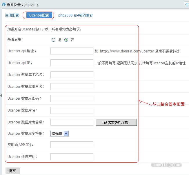1,注册配置 设置禁止注册用户名,E-MAIL等。如下图所示: 2,UCenter配置 配置好基本信息就能实现v9与uc的用户整合,实现与uc应用的同步注册、登录。如下图所示: 1,PHP2008 SP4密码兼容 兼容PHP2008 SP4密码。配置如下图: