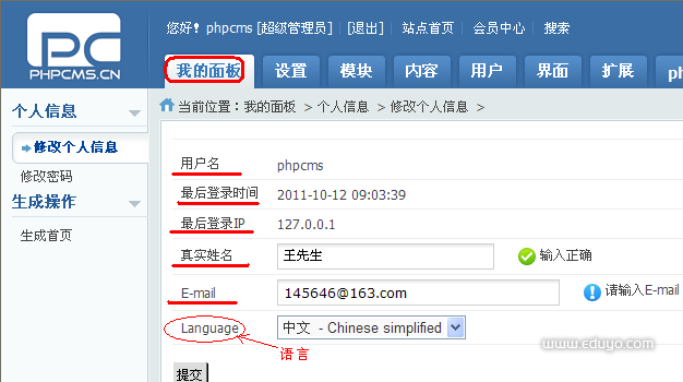 写入你的要修改的数据:真实姓名,E-mail,语言。 提交后,如提示成功则可完成修改操作,否则则提示错误消息。如下图所示: