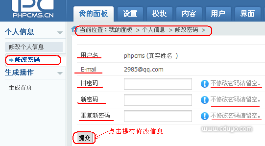 录入你的旧密码和修改的密码。 提交后,如提示成功则可完成修改操作,否则则提示错误消息。如下图所示: