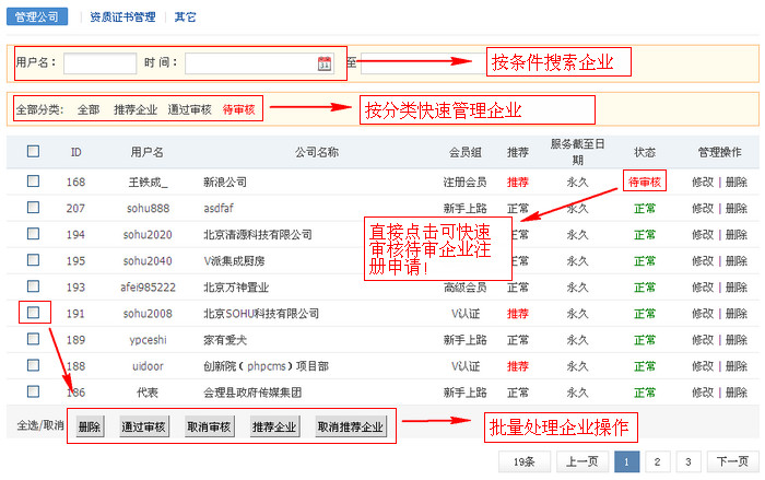管理黄页企业的注册企业信息,可进行查看、修改、删除、审核、推荐等操作。