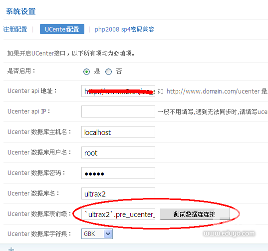 2.登录phpsso后台,系统设置 > uc设置 ,配置相应的整合信息,如图。注意!在前缀前增加数据库名称,格式如:`bbs`.pre_uc_