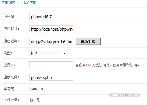 4.登录phpcms后台,进入:phpsso - 应用管理 - 添加应用